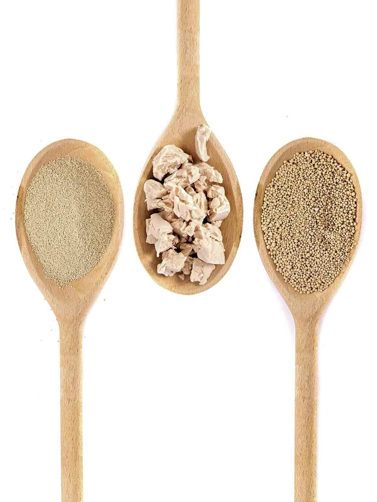 Different forms of yeast (from left to right): Active dried yeast, fresh yeast, dried yeast. All do the same thing, but each type has its own pros and cons. Professional bakers usually prefer fresh yeast, considering it to have a superior flavor, while home bakers usually prefer dried or active dried yeast due to the long shelf life. Image via leitesculinaria.com