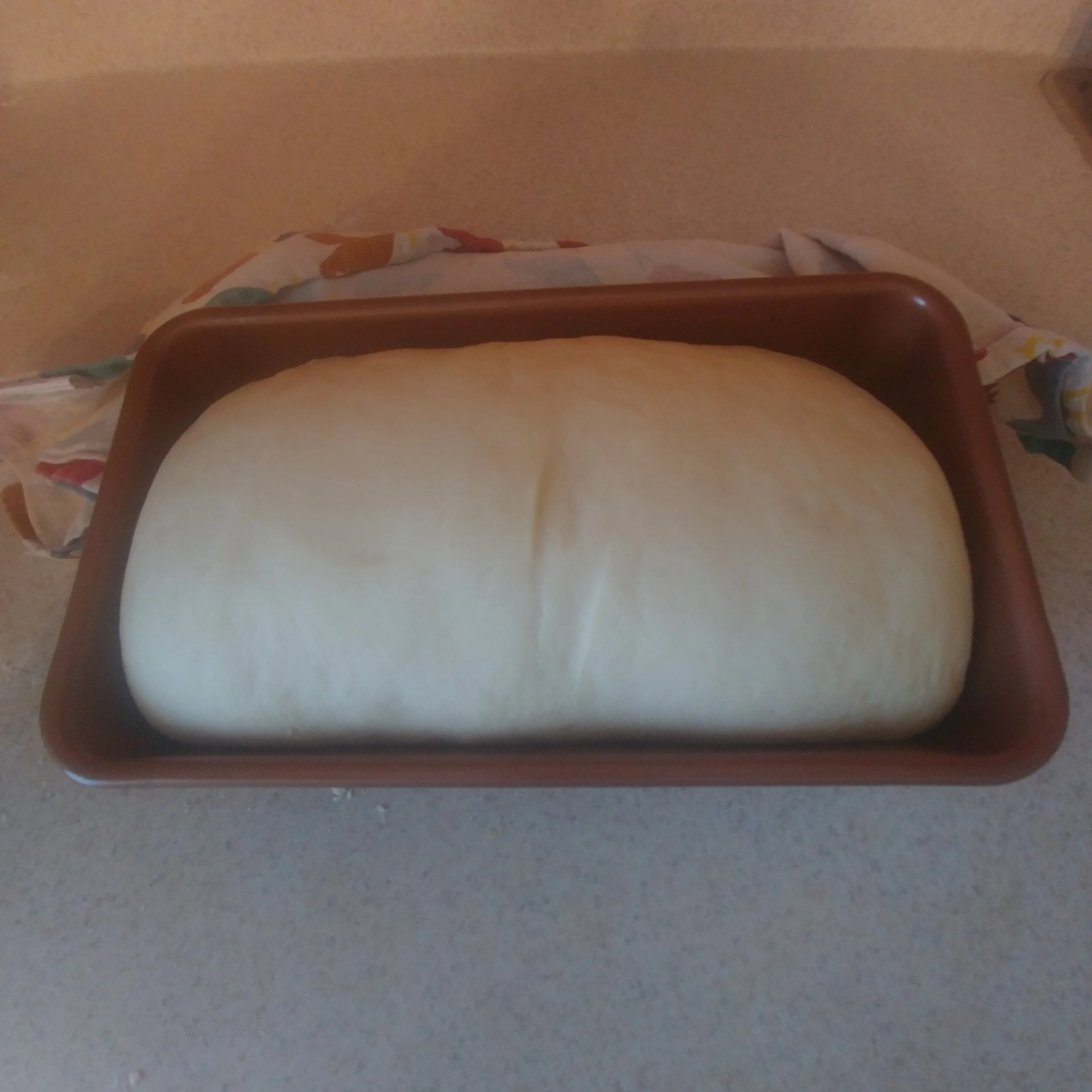 5. After your dough has risen, gently push it down on itself and turn out on a lightly greased surface (although, we usually find that the oil that clings to the dough from the bowl is enough for it to not stick to the counter). Form the dough into an 8” log and place in a lightly greased 8 1/2” x 4 1/2” loaf pan. Cover the pan and allow the dough to rise a second time, about 60 minutes until it’s domed above the edge of the pan. During the last 30 minutes of the dough’s rise, preheat your oven to 350°.