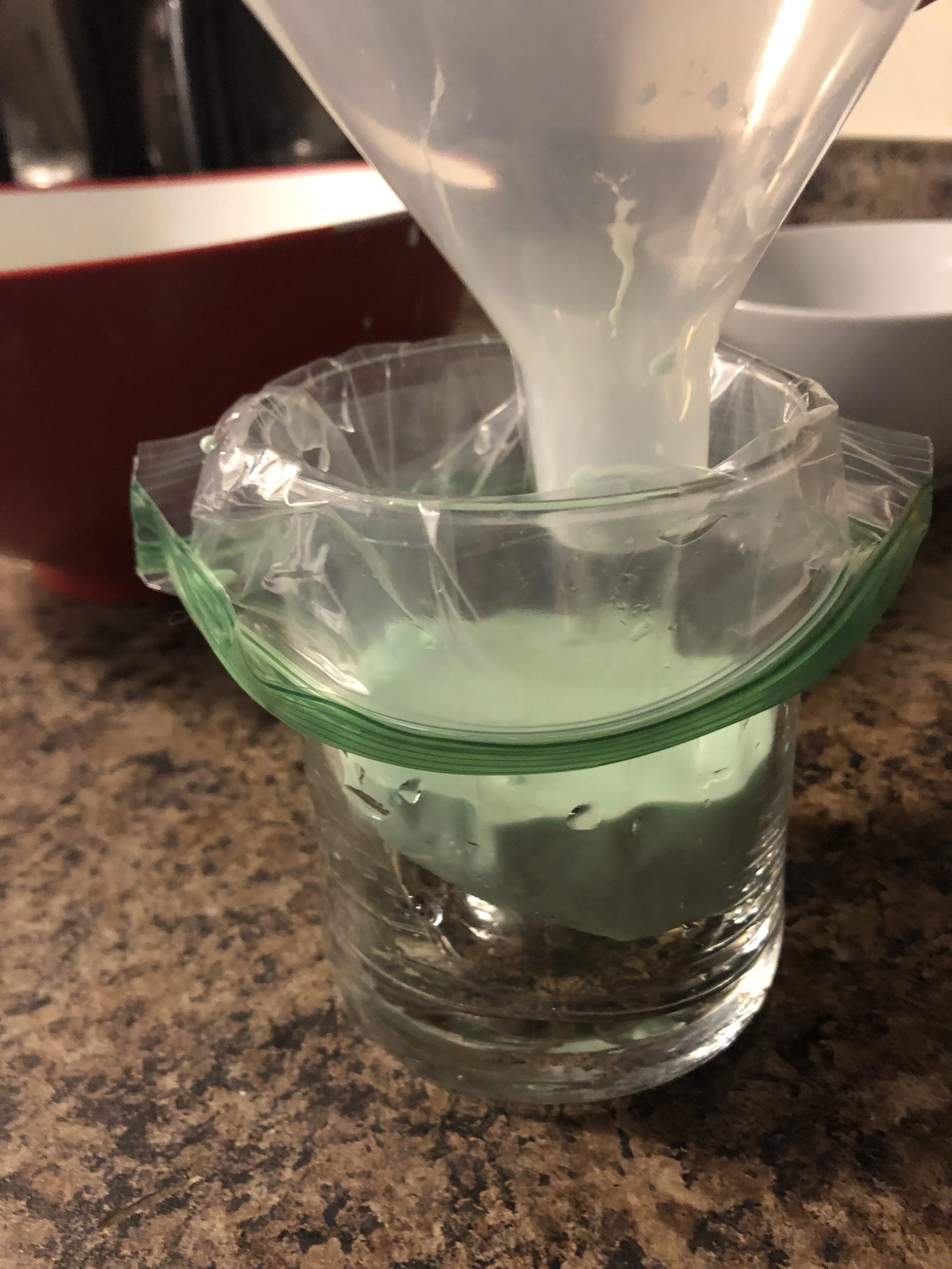 (Handy hint: we avoided a mess by putting the baggie inside an empty glass, folding the edges of the bag upside-down over the rim of the glass, and using a funnel to direct the poured Goo into the bag—see photo)
