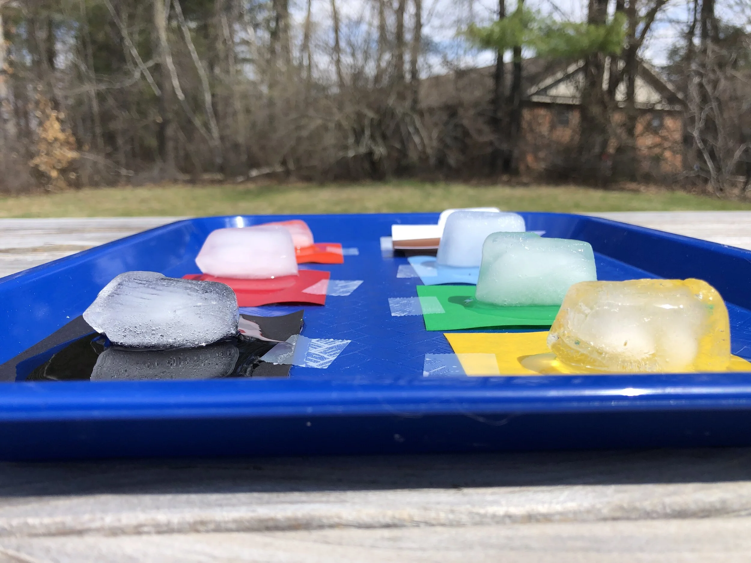 Practical note: At first we used a piece of plain white printer paper to set up the white square on our experimental grid. We were surprised to see, at the 10-minute check-in, that the ice cube on the white paper was melting more quickly than the ice on some of the colors. We realized that the melted ice had soaked through and caused the white paper to become translucent, so that ice was actually on a BLUE surface (the tray underneath was showing through)! We immediately found some white cardstock and placed the ice cube onto TWO squares—which was thick enough to keep the melted ice from soaking through. After this swap, the ice behaved in the way we’d expected.