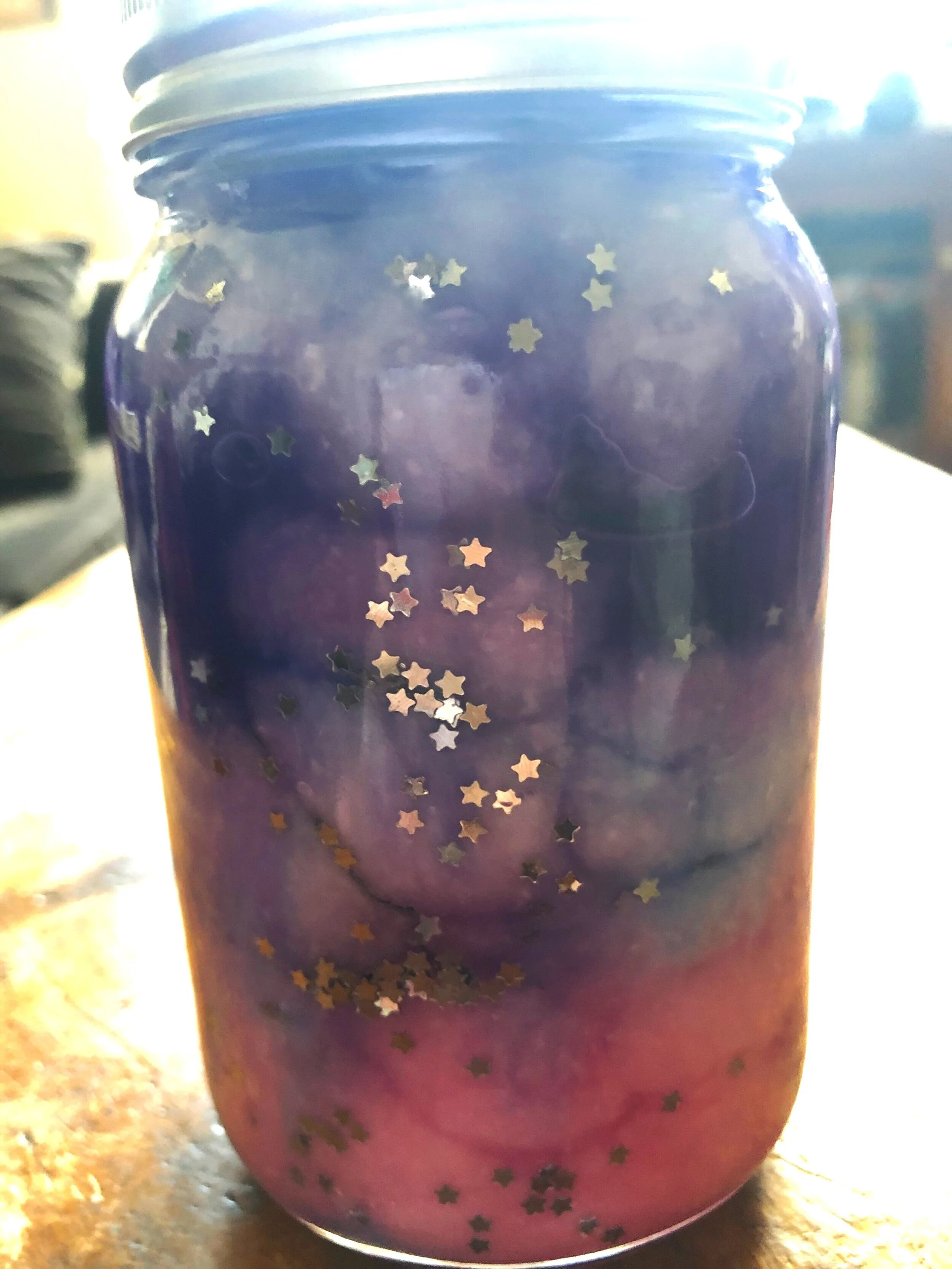 Fill your jar about 1/3 with water (this is for a three-layer/three-color nebula: you can also make more layers, with each layer being slightly smaller, e.g. fill jar 1/4 with water to make a four-layer nebula)