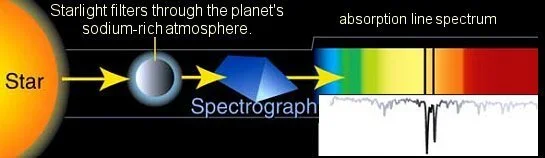 The first direct detection and chemical analysis of the atmosphere of an exoplanet, in 2001. Sodium in the atmosphere filters the starlight of HD 209458 as the giant planet passes in front of the star (image credit: NASA)