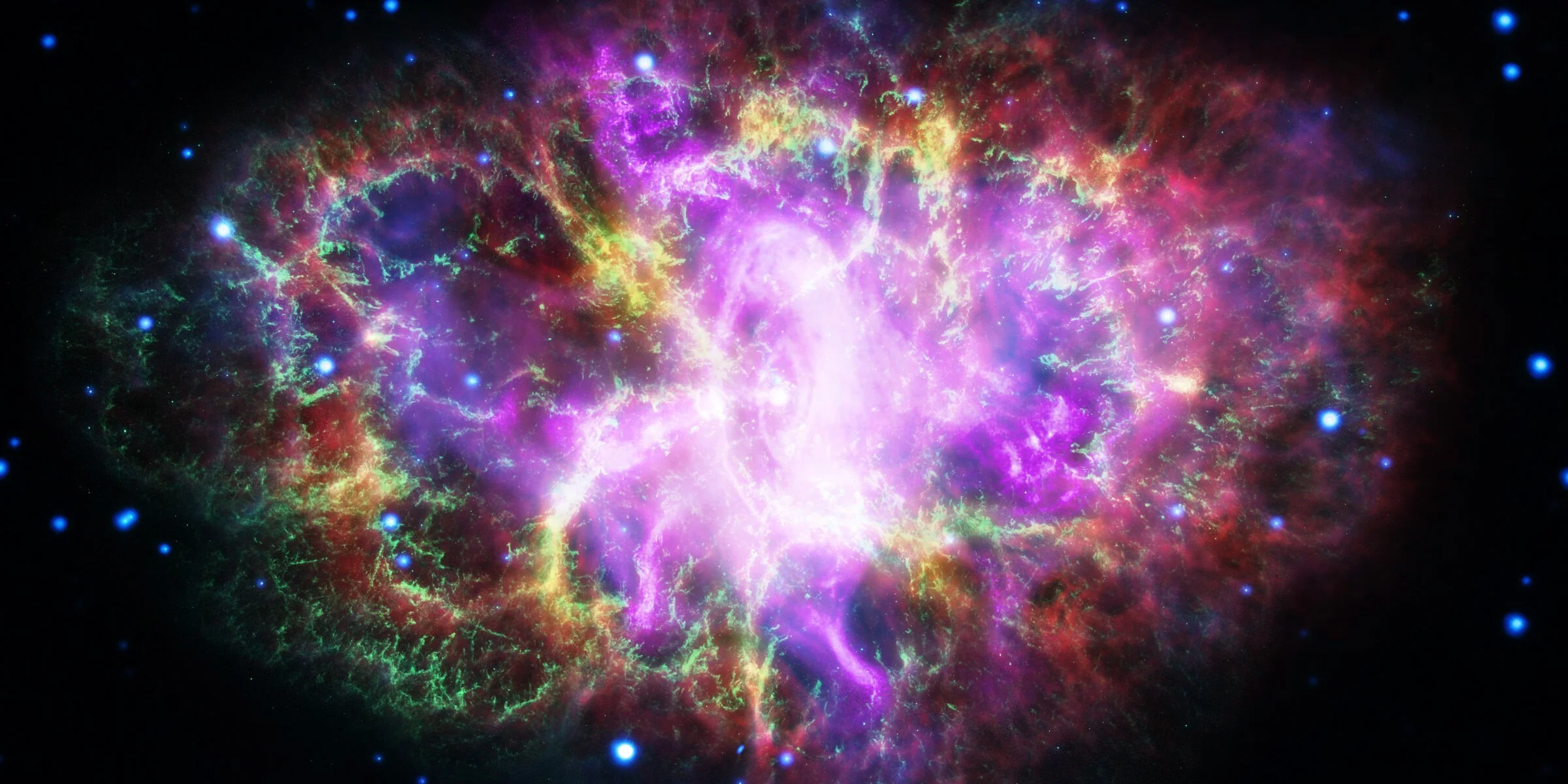 Below: This highly detailed image of the Crab Nebula combines data from telescopes spanning nearly the entire breadth of the electromagnetic spectrum. The picture includes data from five different telescopes: the Spitzer Space Telescope (infrared) in yellow; the Karl G. Jansky Very Large Array (radio) in red; Hubble Space Telescope (visible) in green; XMM-Newton (ultraviolet) in blue; and Chandra X-ray Observatory (X-ray) in purple. (Image credit: NASA)