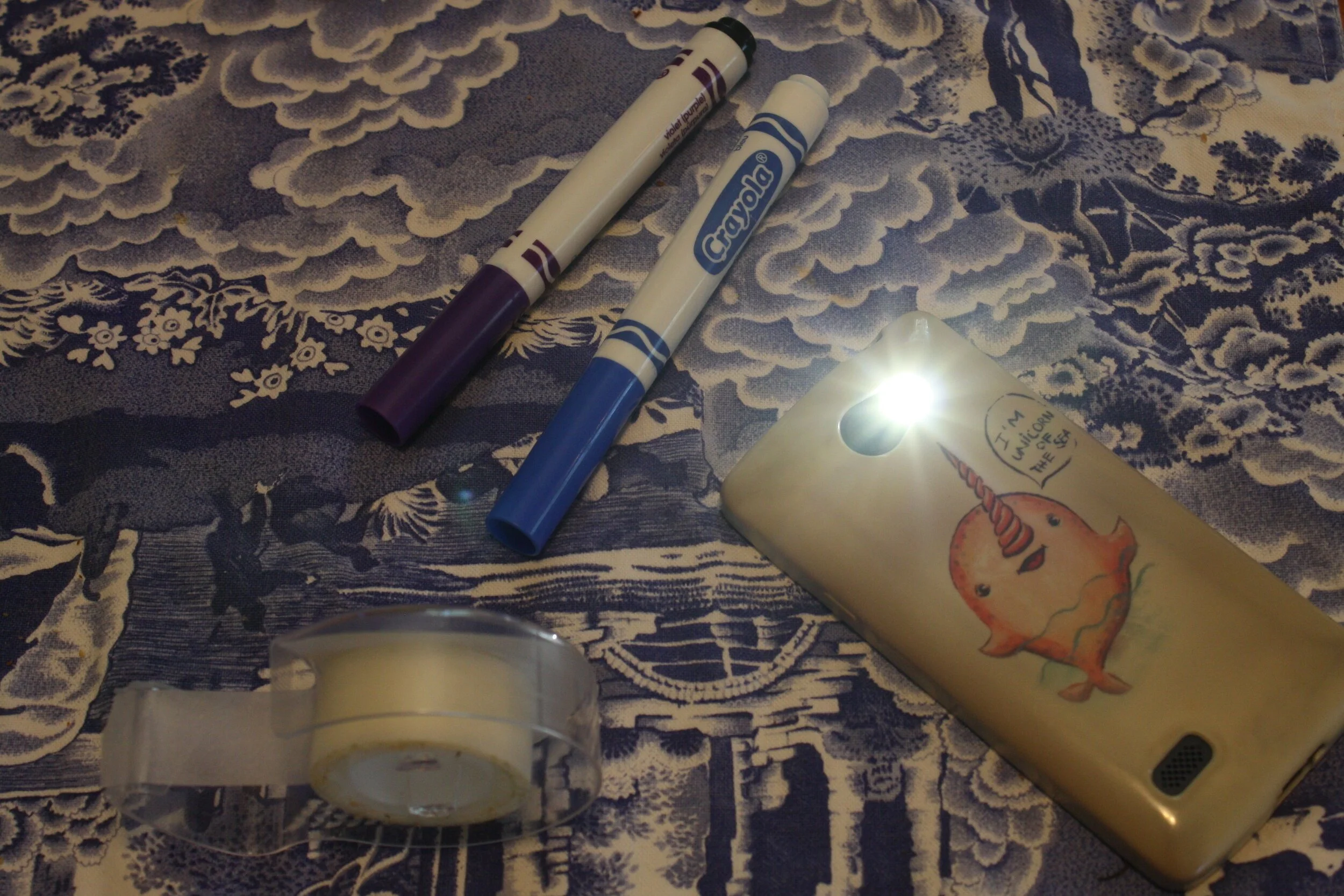Repeat this sequence until you have a dark indigo light coming through- for my phone, this meant a total of 4 blue and 8 purple layers, but it will depend on the brightness of your flashlight