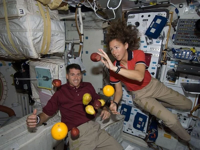 Astronauts Shane Kimbrough and Sandy Magnus play with floating food during the STS-126 shuttle mission (Image Credit: nasa)