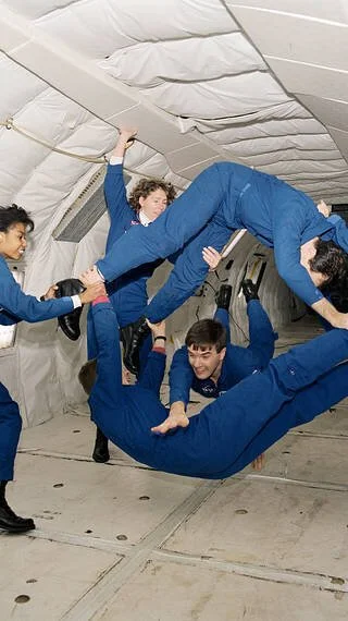 Reduced-gravity aircraft create weightlessness by following a parabolic flight path. Essentially, a plane travels in a path shaped like an upside-down U, rising and then descending at steep angles. Passengers on these flights experience temporary weightlessness —but the effect is brief: a number of seconds, or roughly half a minute, of freefall per flight. This is helpful for some types of research, but it does not allow astronauts to complete prolonged training in weightless conditions…For that, we use water!
