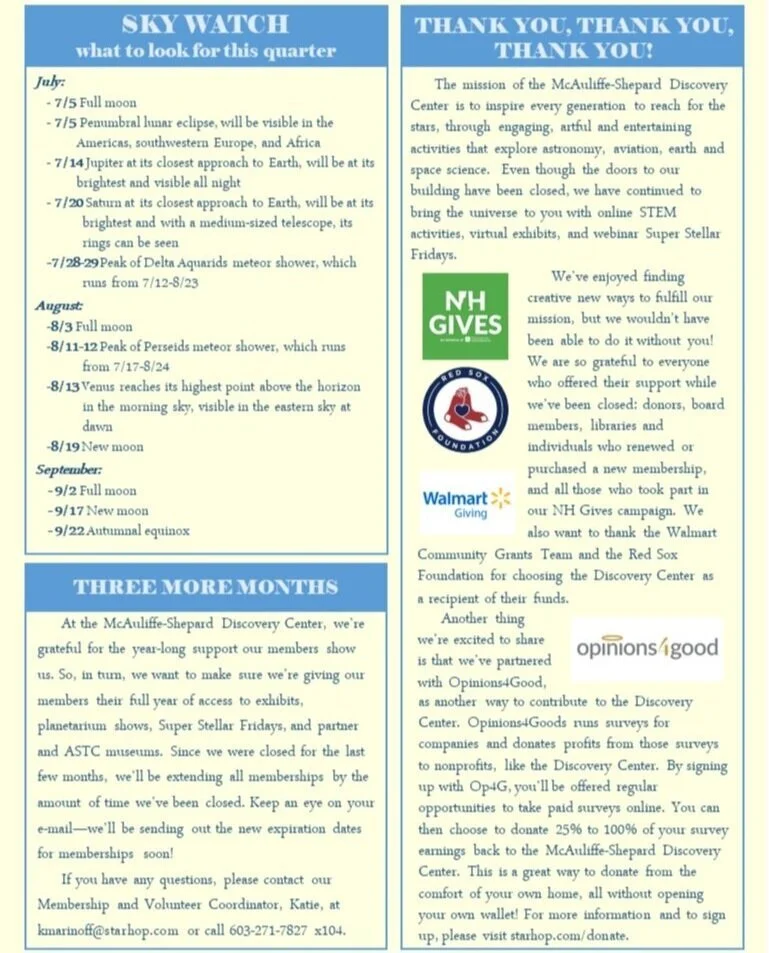 Reopening plans, membership extensions, and what to see in the sky this quarter—read about this and more in the new issue of Cosmos Quarterly! Click through the images below to read this quarter’s newsletter.