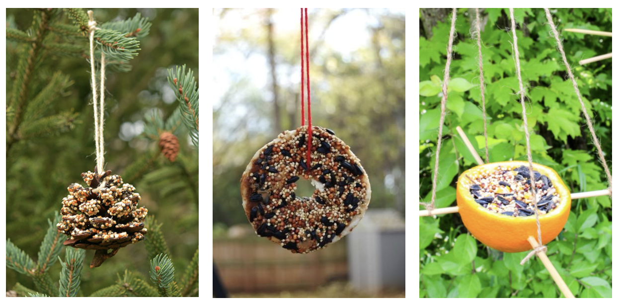 Here are some examples of what the bird feeders may look like after you’ve completed them. (Image credits from left to right: Debbie Chapman; Pinterest; Natural Beach Living)