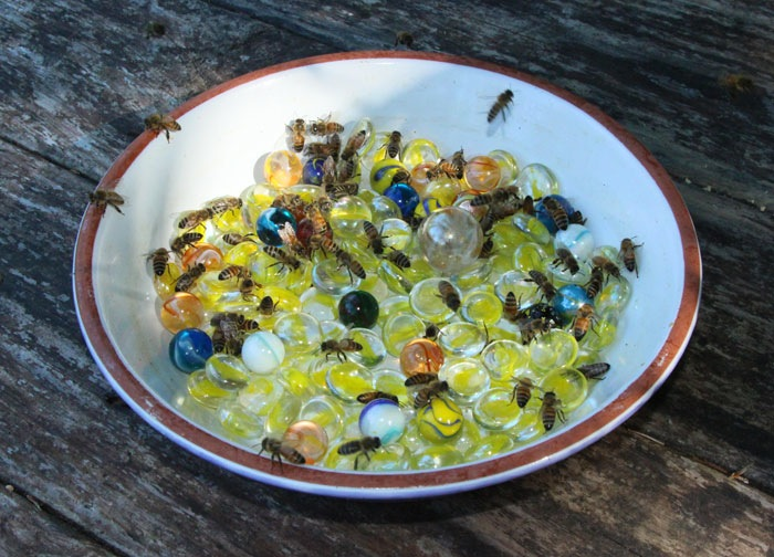 A pollinator watering hole with glass beads for filler. Honeybees can be seen having a drink. (Image credit: Rusty Burlew / Backyard Beekeeping)