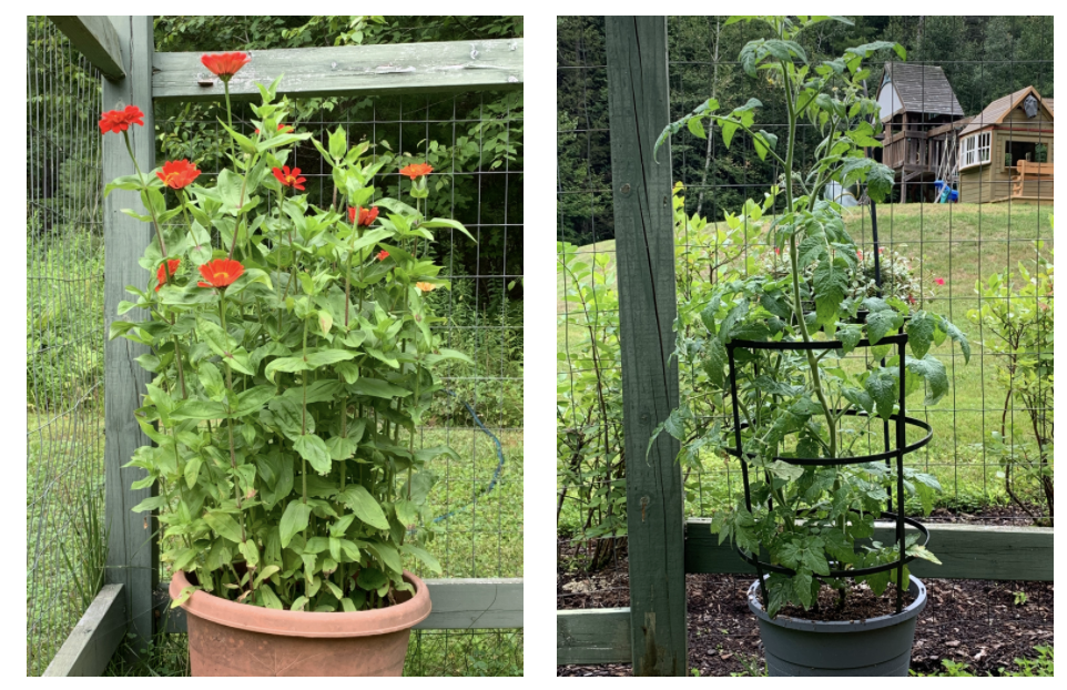 The left photo shows a container of blooming red Zinnias. The right photo is a tomato plant growing in a container. In a couple of weeks, it will have juicy tomatoes.