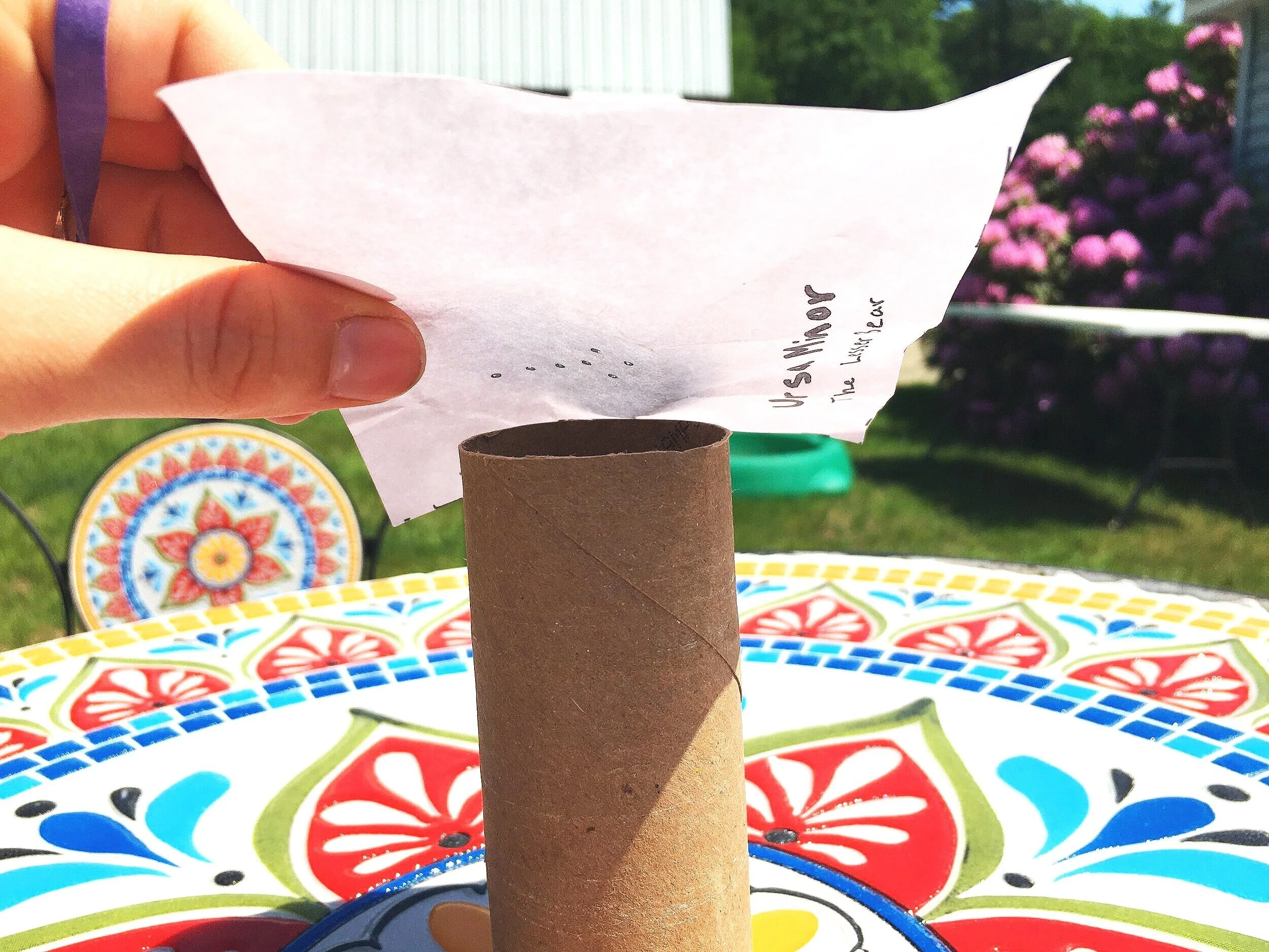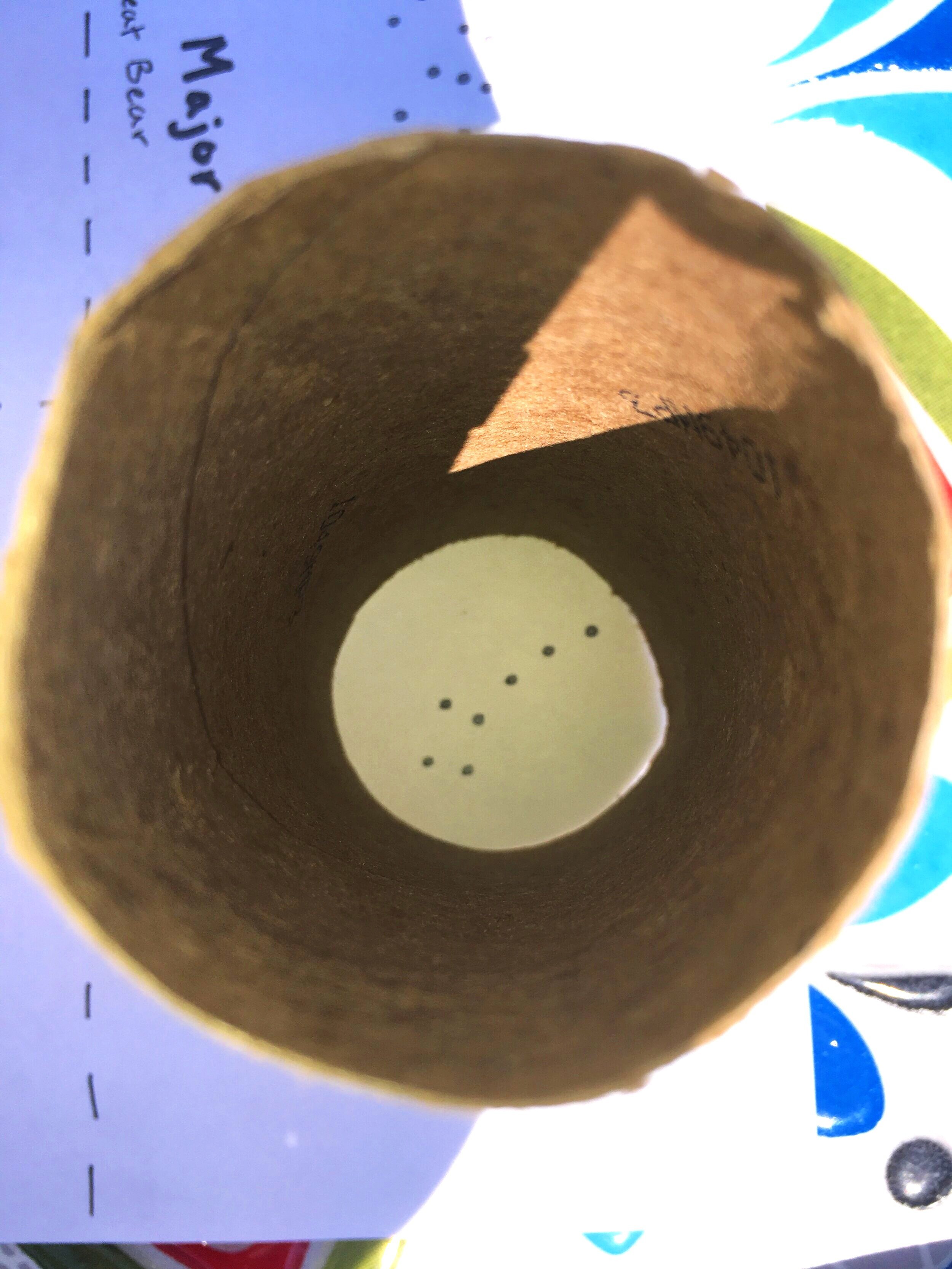 5. Peek through the tube to be sure no light is sneaking in from the sides- you only want the light to come in through the holes you poked in the constellation paper.