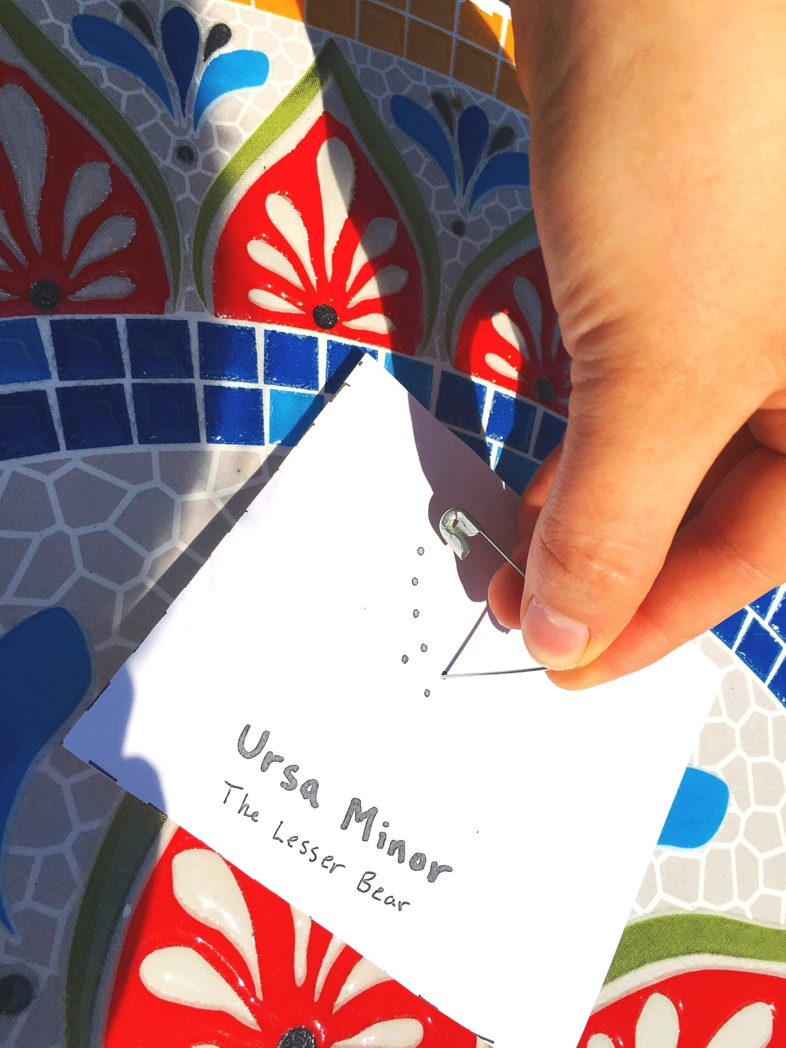 3. Take that piece of cardboard and place it under your constellation paper. Use your needle to stab a hole through each dot of your constellation (the cardboard is there to protect the table underneath). Now, if you are doing this with a child, typically, it’s not a good idea to give children stabbing devices. However, you can explain to them that it is a sharp tool that they need to be careful with and then they may be able to handle it. Use your judgement- you know if your kid’s a stabber.