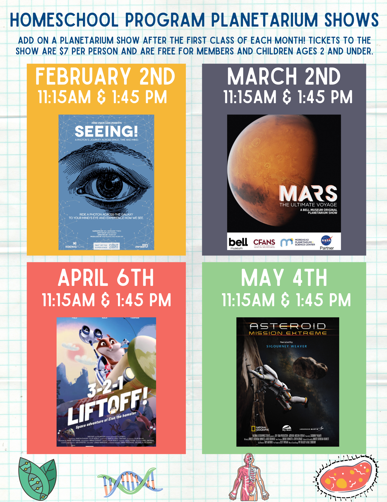 The first show will start at 11:15 AM and the second at 1:45 PM. Tickets can be purchased at the front desk during homeschool session days.