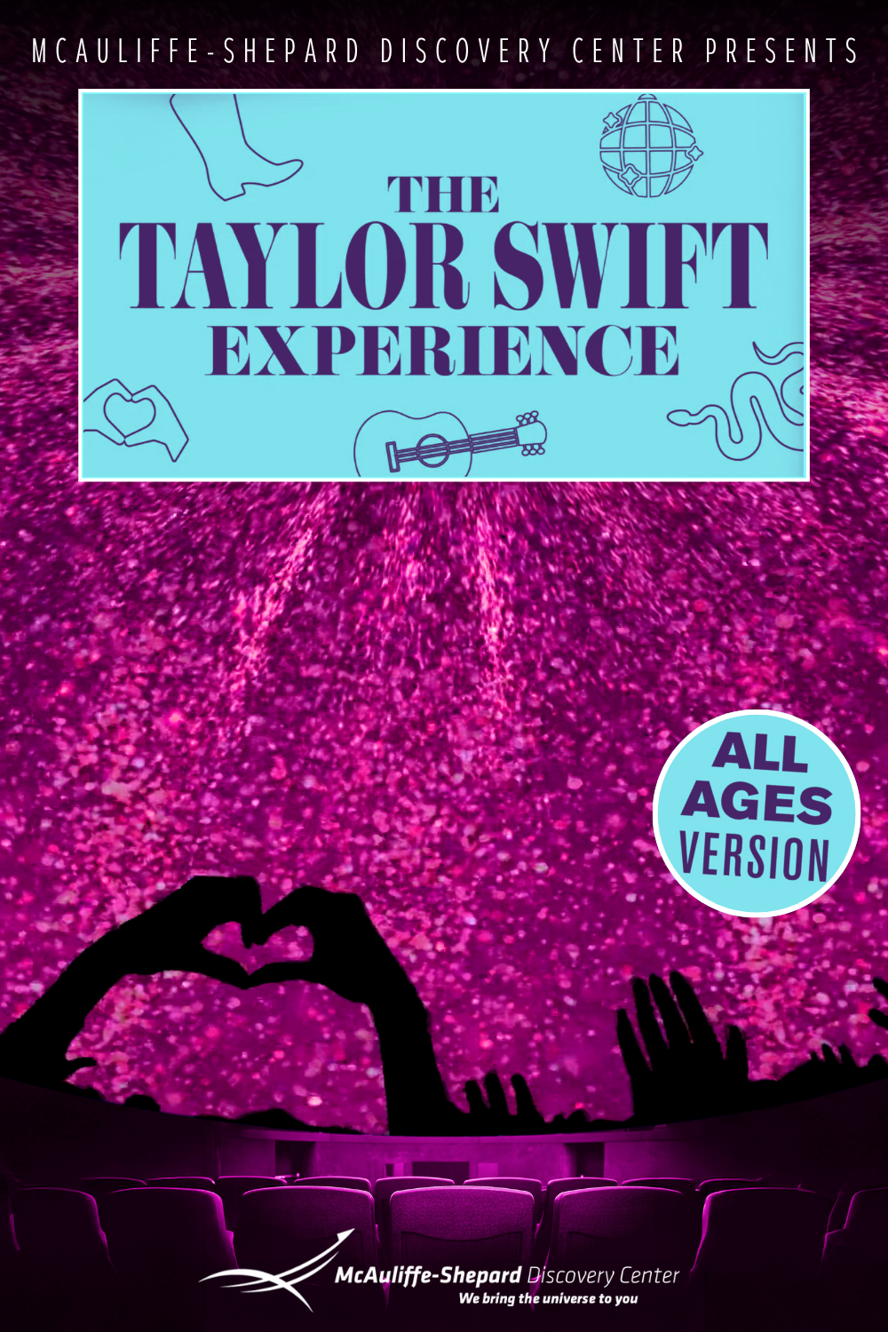 Don’t miss this brand-new Music Under the Dome show, The Taylor Swift Experience (Taylor’s Version), at the Discovery Center! Using the cutting-edge capabilities of the Planetarium, the music of Taylor Swift comes to life in immersive new ways. From Fearless to The Tortured Poets Department, the sounds of your favorite Eras are fused together with stunning and inventive visuals under the dome — all Taylor’s Versions, of course.